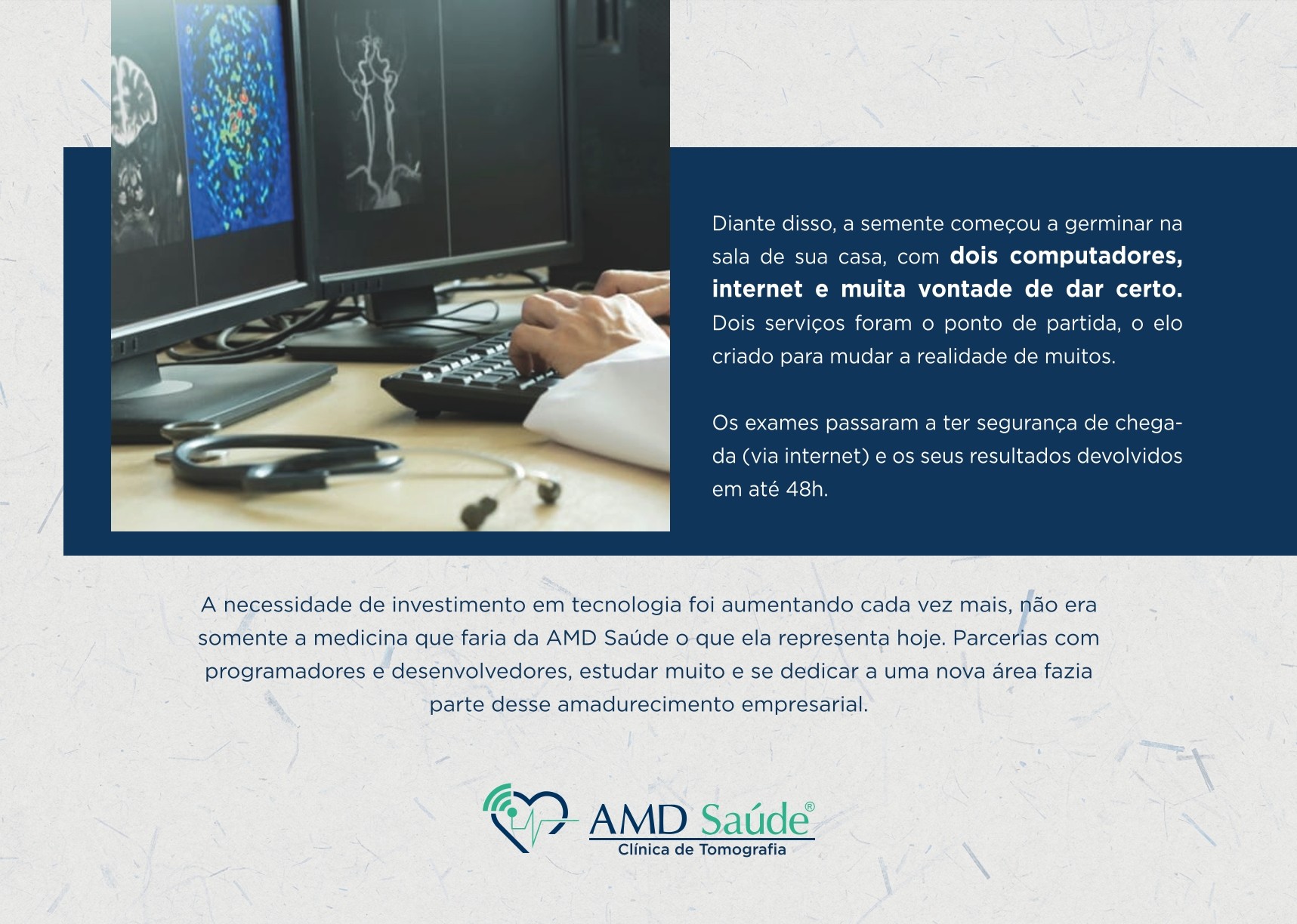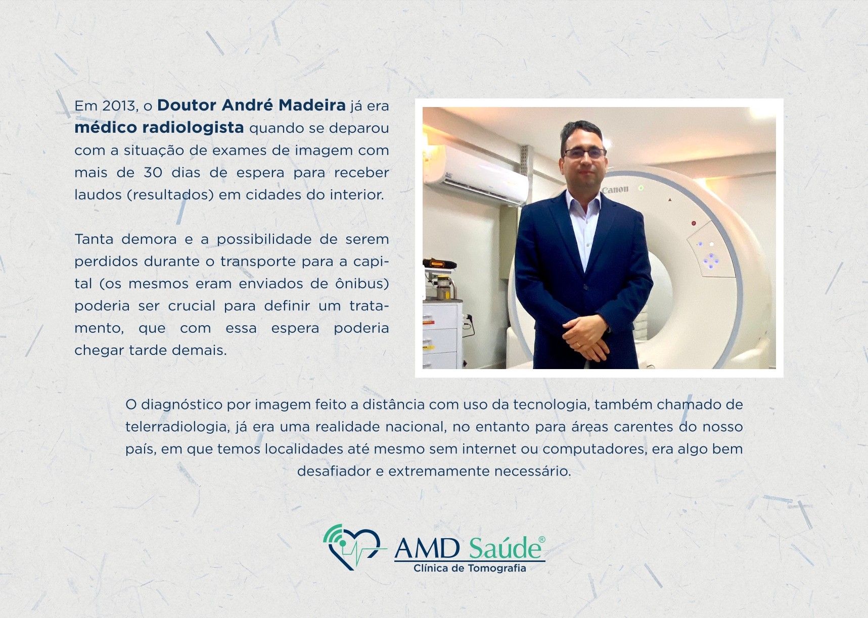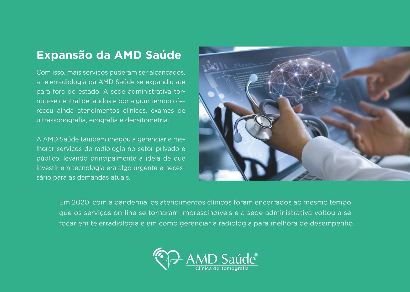 A Assunção & Madeira Diagnósticos – AMD Saúde – iniciou suas atividades atuando no mercado de Telerradiologia em 2013, desenvolvendo sistema próprio para otimizar seu campo de atuação, se enquadrando no que hoje conhecemos como Healthtech, com isso melhorando todo o sistema de saúde ao qual teve vínculo ao longo desses anos, tornando-se especialista em diagnóstico por imagem a distância, com parcerias nos Estados do Pará, Amapá, Maranhão e Pernambuco, já alcançando uma marca de mais de 1 milhão de laudos on-line desde a sua abertura.
