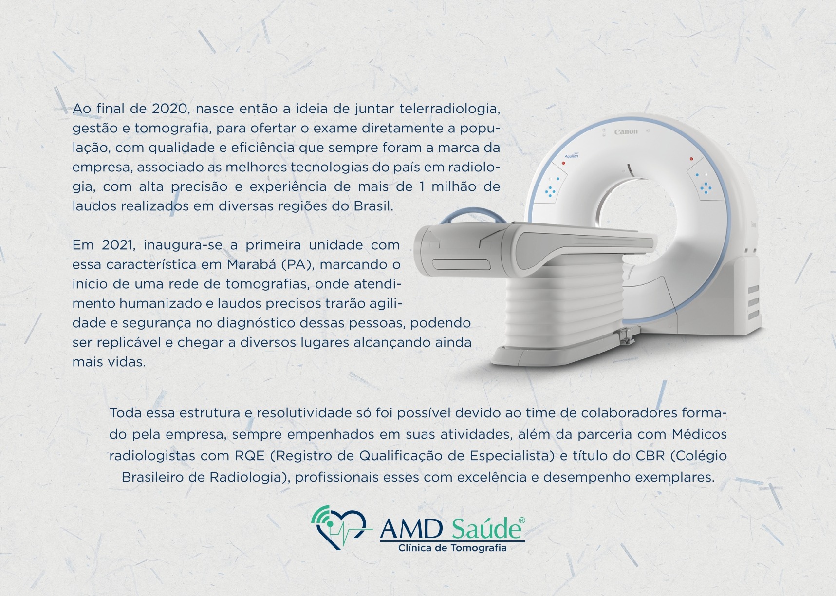 Atualmente, a AMD Saúde está trabalhando de forma direta, com unidade própria, ofertando tomografia aos seus clientes, como experiência única de humanização e rapidez, aliando sua expertise em resultados rápidos e precisos com atendimento humanizado e eficiente.