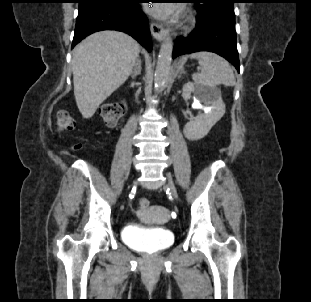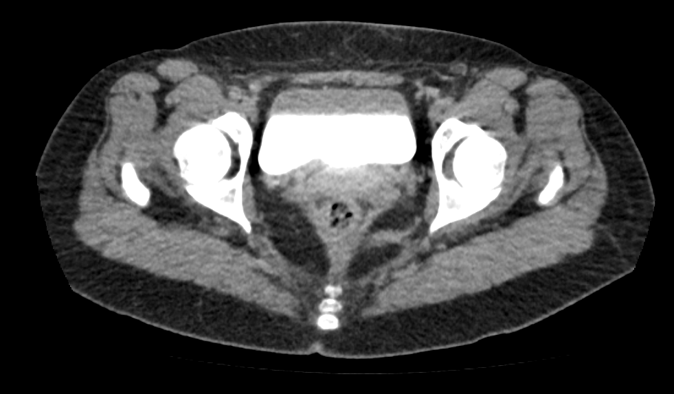 Na tomografia da pelve com uso de contraste, são analisadas as estruturas vasculares da região estudada. A solução de contraste iodado é administrada por via endovenosa e distribui o contraste entre as estruturas com fluxos sanguíneos, realçando as estruturas hipervascularizadas, mostrando, por exemplo, tumores ou processos inflamatórios.